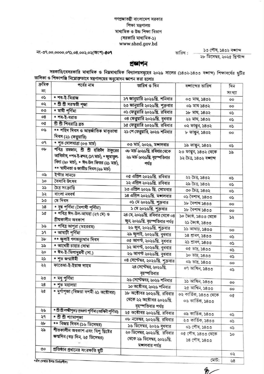 সরকারি-বেসরকারি মাধ্যমিক ও নিম্ন মাধ্যমিক বিদ্যালয়ের ২০২৬ শিক্ষাবর্ষের ছুটির তালিকা প্রকাশ করেছে শিক্ষা মন্ত্রণালয়। এতে ছুটি রাখা হয়েছে ৬৪ দিন, যা গত বছর ছিল ৭৬ দিন। সেই হিসাবে এবার ছুটি কমেছে ১২ দিন।