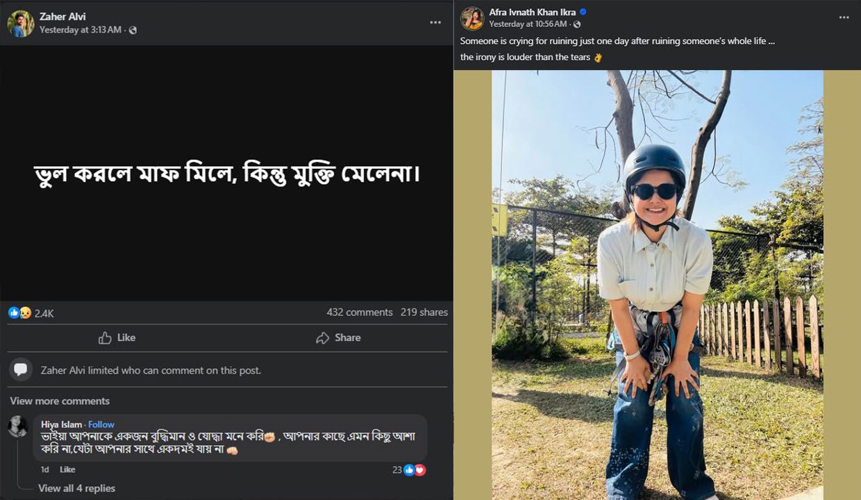 এই পোস্টের ঠিক কয়েক ঘণ্টা পর, শুক্রবার সকাল ১০টা ৫৬ মিনিটে ইকরা একটি হাস্যোজ্জ্বল ছবি দিয়ে ইংরেজিতে একটি ইঙ্গিতপূর্ণ স্ট্যাটাস দেন। সেখানে তিনি লেখেন, কেউ একজন কারও পুরো জীবনটা ধ্বংস করে দেওয়ার পর নিজের মাত্র একটা দিন নষ্ট হওয়ার জন্য কাঁদছে... কান্নার চেয়ে এই পরিহাসের আওয়াজ অনেক বেশি তীক্ষ্ণ।