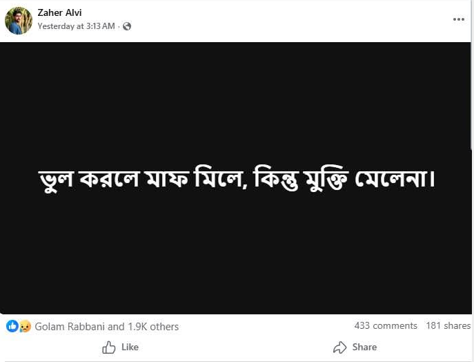 পোস্টে আলভী লেখেন, ‘ভুল করলে মাফ মিলে, কিন্তু মুক্তি মেলে না।’ এর জবাবে তার স্ত্রী ইকরা মন্তব্য করেন, ‘ভুল করলে মাফও মিলে না, মুক্তিও মেলে না। আমিন! আমার আমিকে মুক্তি করে দিলাম। আবার কষ্ট কেন!’ এই মন্তব্য এখন নতুন করে প্রশ্নের জন্ম দিচ্ছে।