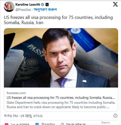 আগামী ২১ জানুয়ারি থেকে এই স্থগিতাদেশ কার্যকর হবে এবং পররাষ্ট্র দফতর অভিবাসী ভিসা প্রক্রিয়া পুনর্মূল্যায়ন শেষ না করা পর্যন্ত তা অনির্দিষ্টকালের জন্য বহাল থাকবে বলে জানানো হয়েছে।