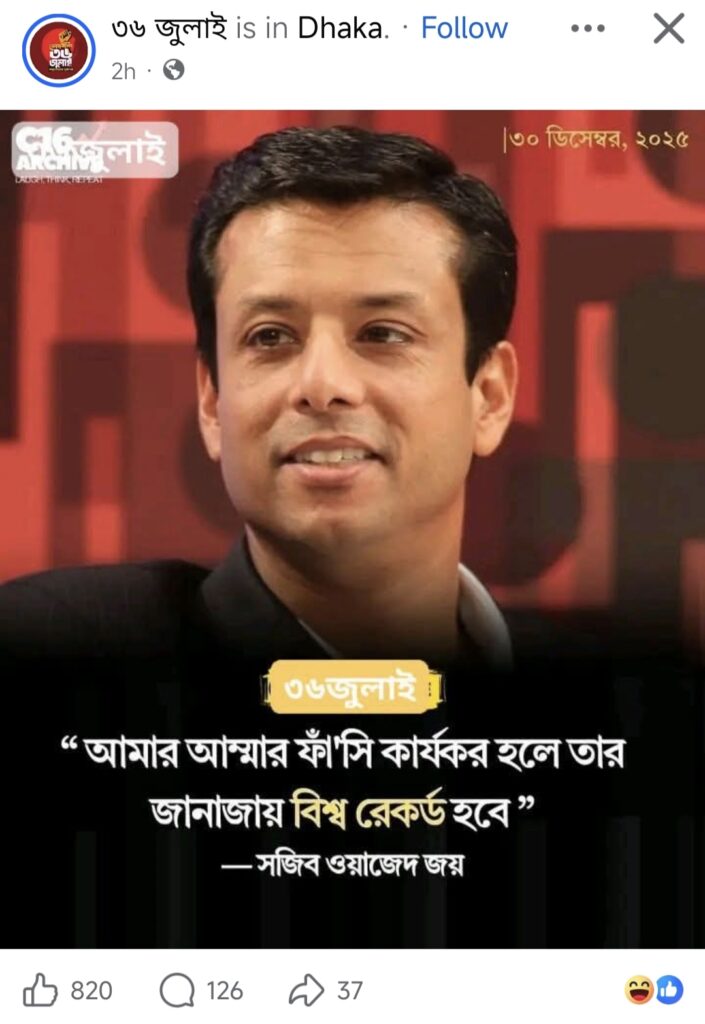 সম্প্রতি সামাজিক যোগাযোগ মাধ্যমে দাবি প্রচার করা হয়েছে, আদালত কর্তৃক দণ্ডিত ক্ষমতাচ্যুত প্রধানমন্ত্রী শেখ হাসিনার পুত্র সজীব ওয়াজেদ জয় বলেছেন- ‘আমার আম্মার ফাঁ’সি কার্যকর হলে তার জানাজায় বিশ্ব রেকর্ড হবে’।