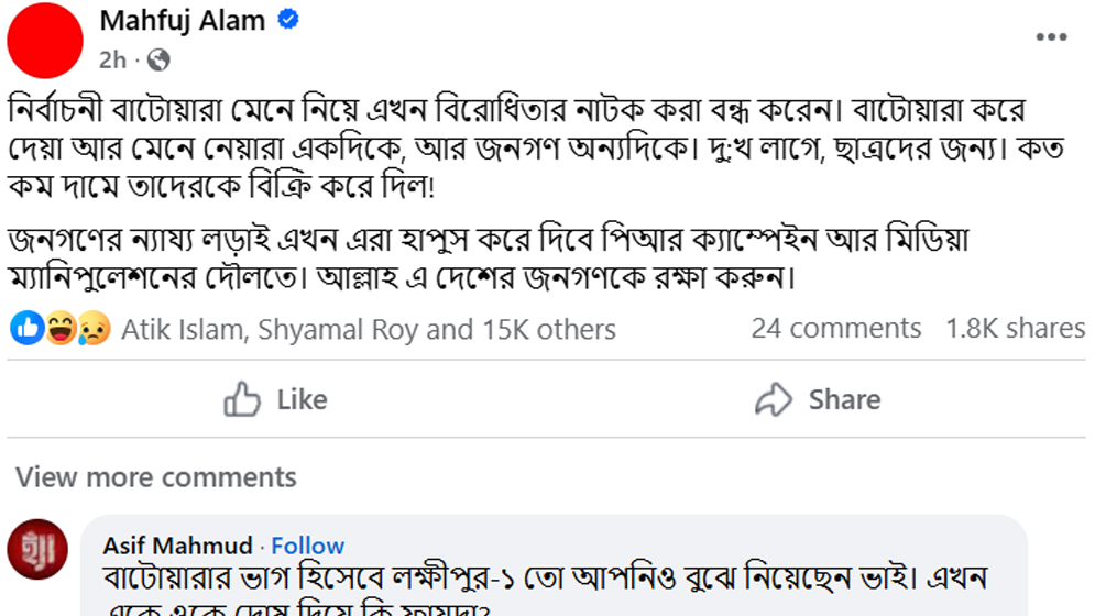 পোস্টে তিনি লেখেন, নির্বাচনি বাটোয়ারা মেনে নিয়ে এখন বিরোধিতার নাটক করা বন্ধ করেন। বাটোয়ারা করে দেওয়া আর মেনে নেওয়ারা একদিকে, আর জনগণ অন্যদিকে। দুঃখ লাগে, ছাত্রদের জন্য। কত কম দামে তাদেরকে বিক্রি করে দিল!