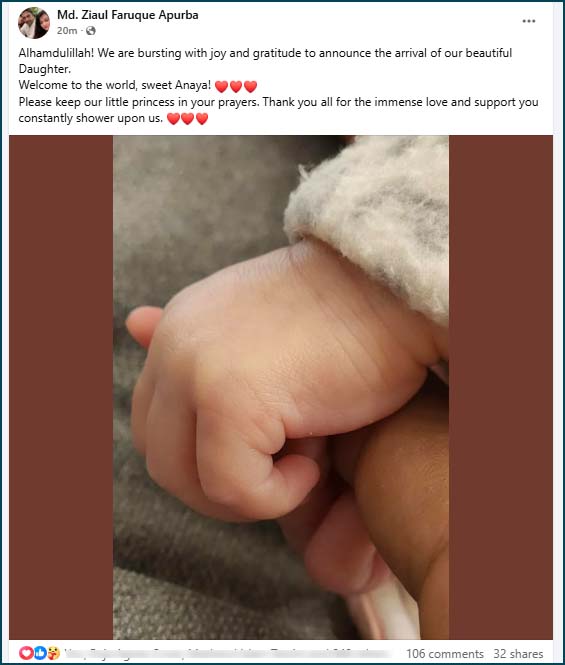অপূর্ব পোস্টে লিখেছেন, ‘আলহামদুলিল্লাহ। আনন্দ আর কৃতজ্ঞতার সঙ্গে জানাচ্ছি, আমাদের কন্যাসন্তানের আগমন ঘটেছে। এই দুনিয়ায় তোমাকে স্বাগতম, প্রিয় আনায়া।’