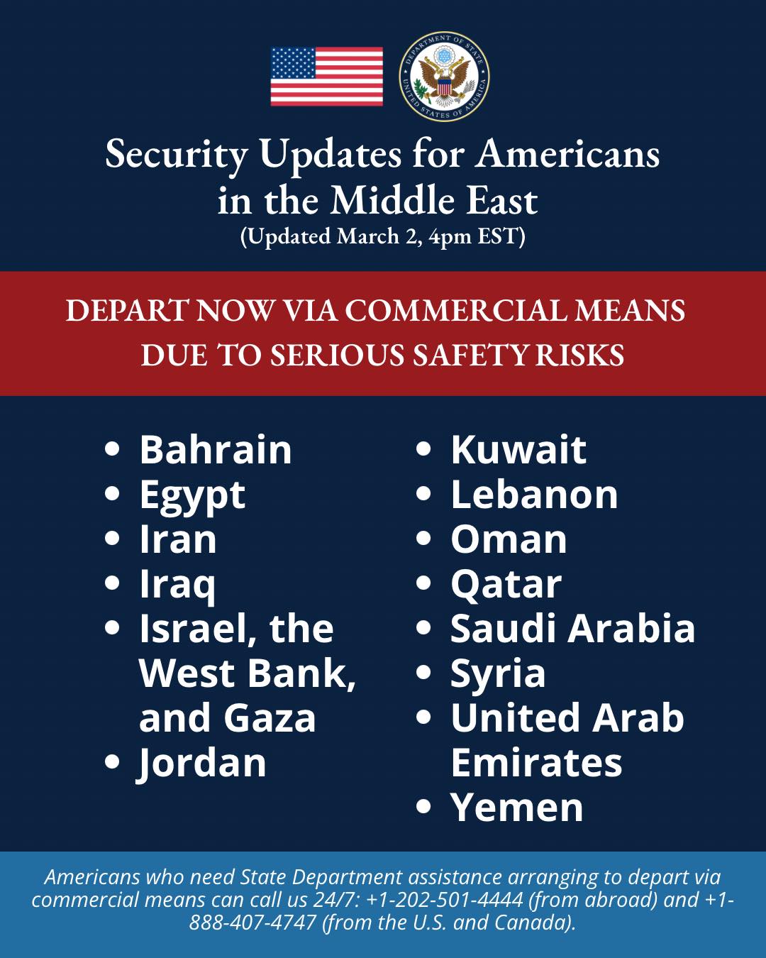 ইরানের সঙ্গে চলমান সংঘাতের জেরে মার্কিন নাগরিকদের এখনই মধ্যপ্রাচ্যের কয়েকটি দেশ ছাড়ার তাগিদ দিয়েছে যুক্তরাষ্ট্রের পররাষ্ট্র দফতর।
