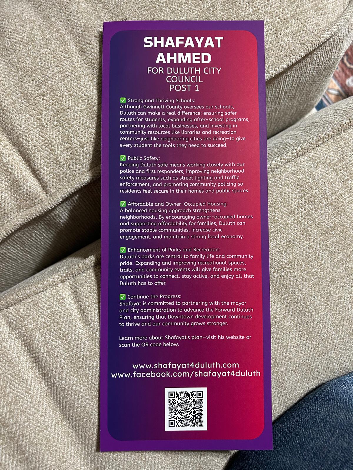শাফায়েত আহমেদ নির্বাচিত হলে শিক্ষা, বাড়ির মালিকানা এবং জননিরাপত্তা জোরদার করার পাশাপাশি ডুলুথকে অতিথিপরায়ণ শহর হিসেবে পরিচিত রাখার অঙ্গীকার করেছেন।
