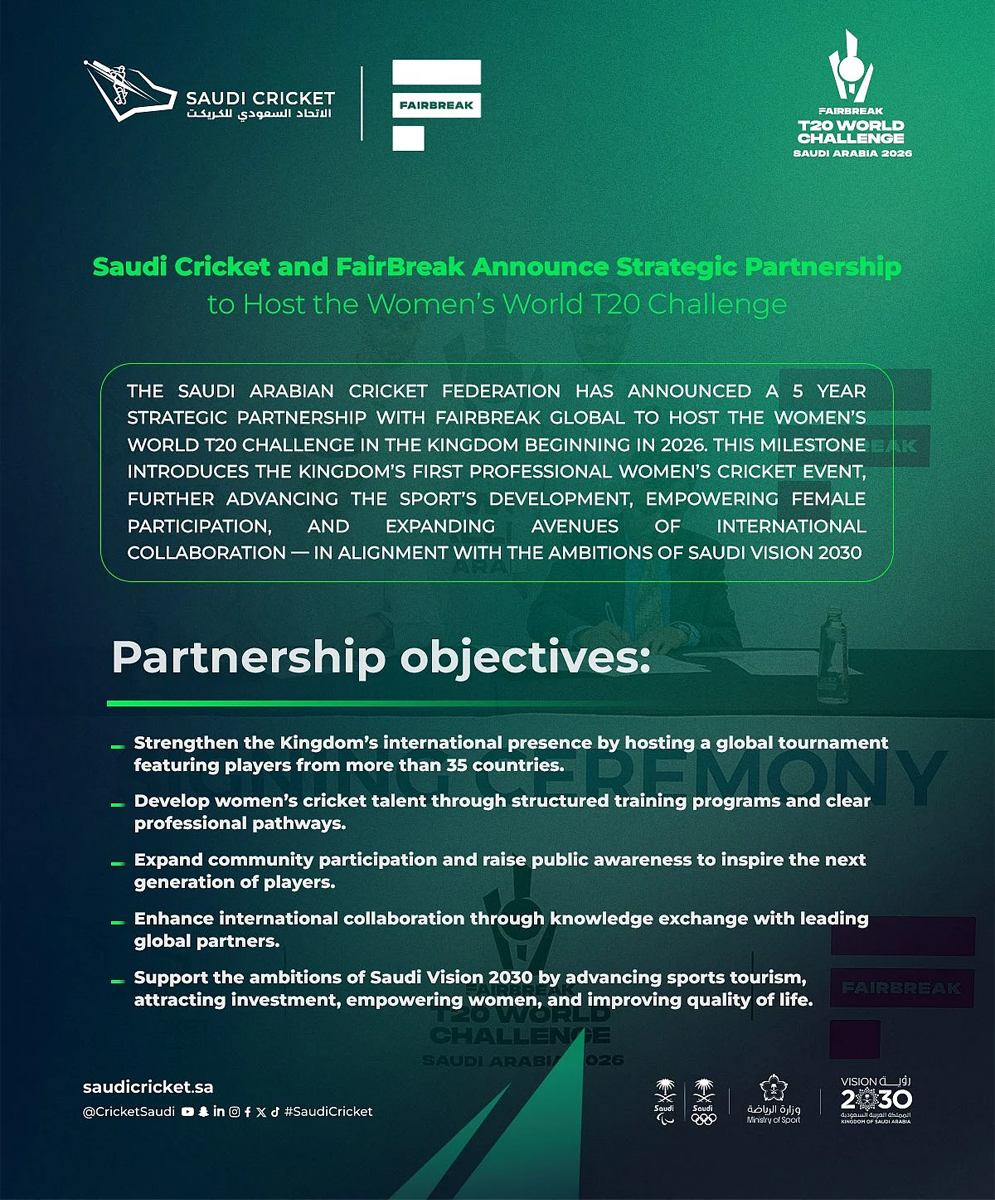 বেসরকারি প্রতিষ্ঠান ফেয়ারব্রেক এবং সৌদি ক্রিকেটের যৌথ উদ্যোগে ২০২৬ সাল থেকে সৌদি আরবে উইমেনস ওয়ার্ল্ড টি-টোয়েন্টি চ্যালেঞ্জ শুরু হবে। এটি হবে দেশটির প্রথম পেশাদার নারী ক্রিকেট টুর্নামেন্ট।