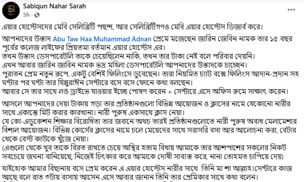 তিনি আরও লেখেন, তিনি (ত্বহা আদনান) এখন নিয়মিত সেই এয়ার হোস্টেসের সঙ্গে ফোনে কথা বলেন, লং ড্রাইভে যাওয়ার পরিকল্পনা করেন। সেন্টারে বিভিন্ন ক্লাসের নামে মেয়েদের সঙ্গে একান্তে বসেন। যে কো-এডুকেশন বা নারী-পুরুষের মিশ্র শিক্ষা ব্যবস্থার তিনি প্রকাশ্যে বিরোধিতা করেন, তার প্রতিষ্ঠানেই সেই নিয়ম চলছে।