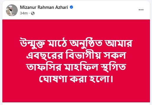 পোস্টে তিনি লিখেন- ‘উন্মুক্ত মাঠে অনুষ্ঠিত আমার এবছরের বিভাগীয় সকল তাফসির মাহফিল স্থগিত ঘোষণা করা হলো।’