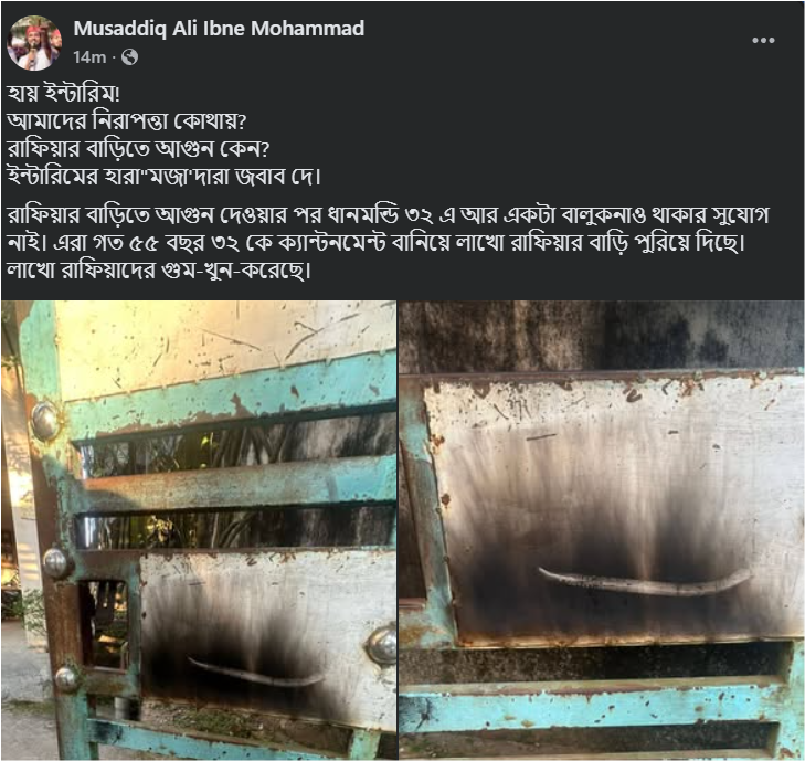 মুসাদ্দিক তার পোস্টে জানান, ‘ডাকসুর কার্যনির্বাহী সদস্য রাফিয়ার বাসায় আজ ভোরে গান পাউডার দিয়ে আগুন দিয়েছে এবং ককটেল বিস্ফোরণ ঘটিয়েছে জঙ্গি লীগ।