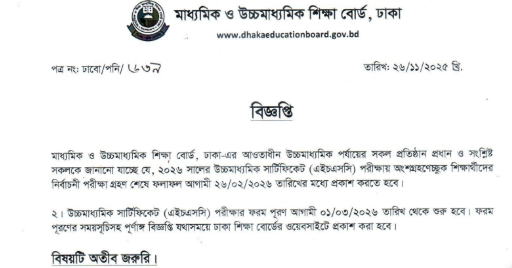 ২০২৬ সালের উচ্চ মাধ্যমিক স্কুল সার্টিফিকেট (এইচএসসি) ও সমমানের নির্বাচনী পরীক্ষার ফল প্রকাশ এবং মূল পরীক্ষার ফরম পূরণের তারিখ ঘোষণা করেছে ঢাকা মাধ্যমিক ও উচ্চ মাধ্যমিক শিক্ষা বোর্ড।