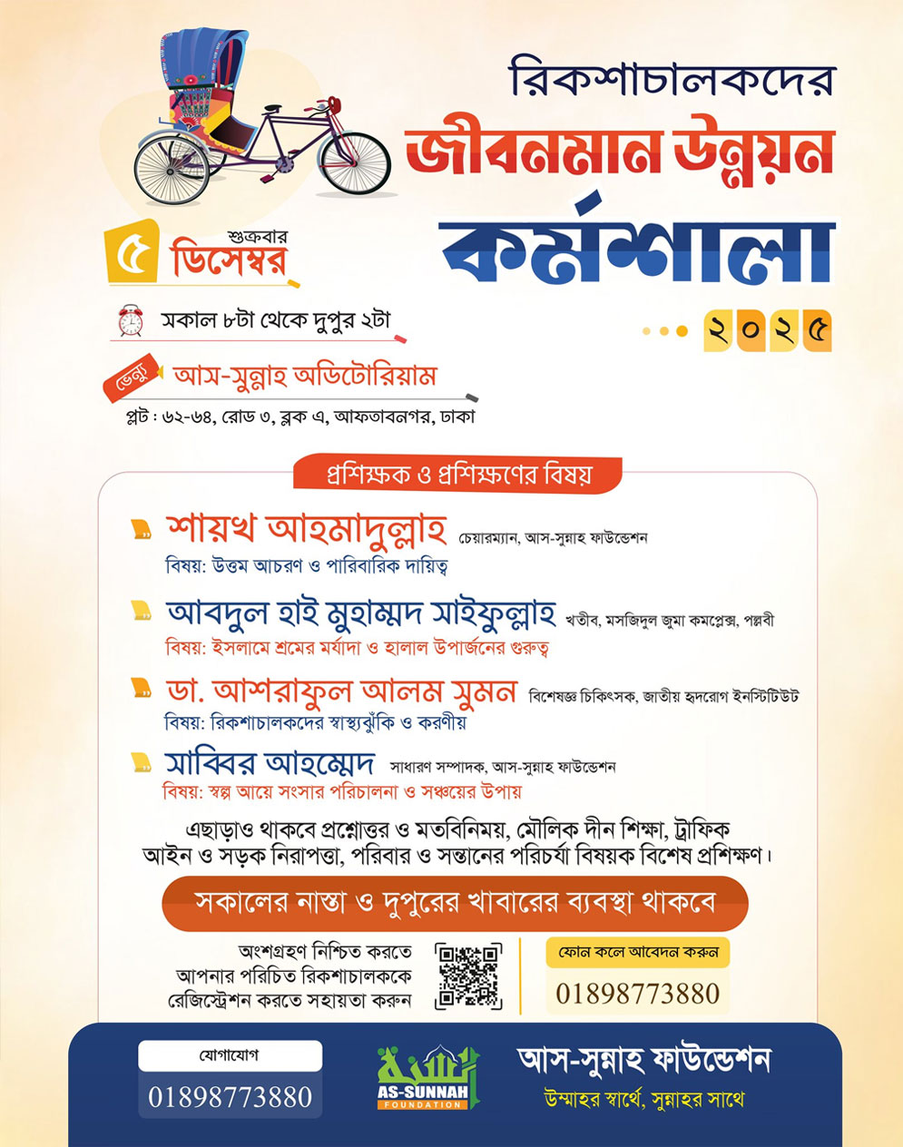 রিকশাচালকদের জন্য ‘জীবনমান উন্নয়ন কর্মশালা’ শীর্ষক নতুন একটি উদ্যোগের আয়োজন করতে যাচ্ছে আস-সুন্নাহ ফাউন্ডেশন। কর্মশালায় বিশেষজ্ঞদের মাধ্যমে তাদের ধর্মীয় ও সামাজিক জীবন সুন্দরভাবে পরিচালনার প্রয়োজনীয় প্রশিক্ষণ দেওয়া হবে। আগামী ৫ ডিসেম্বর (শুক্রবার) সকাল ৮টা থেকে দুপুর ২টা পর্যন্ত রাজধানীর আফতাবনগরে আস-সুন্নাহ অডিটরিয়ামে এ কর্মশালা অনুষ্ঠিত হবে।