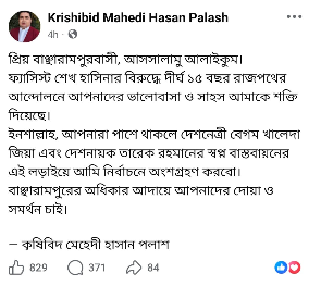 পোস্টে তিনি লেখেন, ‘প্রিয় বাঞ্ছারামপুরবাসী, আসসালামু আলাইকুম। ফ্যাসিস্ট শেখ হাসিনার বিরুদ্ধে দীর্ঘ ১৫ বছর রাজপথের আন্দোলনে আপনাদের ভালোবাসা ও সাহস আমাকে শক্তি দিয়েছে। ইনশাল্লাহ, আপনারা পাশে থাকলে দেশনেত্রী বেগম খালেদা জিয়া এবং দেশনায়ক তারেক রহমানের স্বপ্ন বাস্তবায়নের এই লড়াইয়ে আমি নির্বাচনে অংশগ্রহণ করব। বাঞ্ছারামপুরের অধিকার আদায়ে আপনাদের দোয়া ও সমর্থন চাই।’
