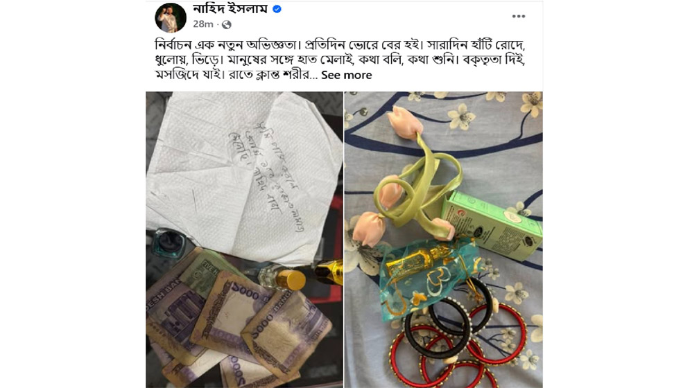 পোস্টে নাহিদ লিখেছেন, নির্বাচন এক নতুন অভিজ্ঞতা। প্রতিদিন ভোরে বের হই। সারাদিন হাঁটি রোদে, ধুলোয়, ভিড়ে। মানুষের সঙ্গে হাত মেলাই, কথা বলি, কথা শুনি। বক্তৃতা দিই, মসজিদে যাই। রাতে ক্লান্ত শরীর নিয়ে বাসায় ফিরি।
